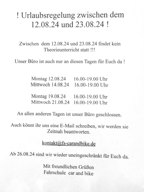 Newsticker: +++ Jetzt Motorradausbildun 2025 starten +++ Unser nächster Ferienkurs beginnt am 03.11.2025 (Herbstferien) +++ New Car Q4 E-Tron - jetzt bei uns in der Fahrschule +++ Nächster Nachschulungskurs: Beginn 07.11.2025!!! - Infos in der Fahrschule +++ Jetzt Motorradausbildung 2025 starten !!! +++ B196-Motorradfahren ohne theoretische und praktische Prüfung ...Ausbildung auch auf Automatikroller !!! +++ Nächster Erster Hilfe Kurs: --.--.2025 +++